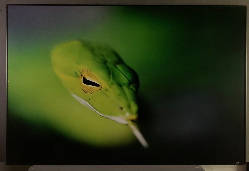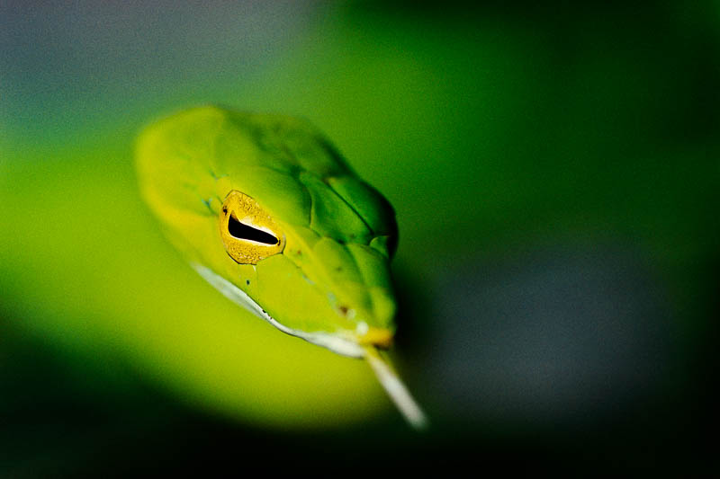 The elegant green whip snake. Horizontal slit irises signify its reptilian ancestry and it is venomous but the venom is not strong enough to cause harm to humans