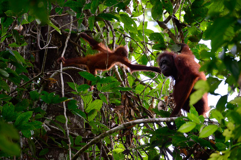 Two orangutans holding hands in the trees, framed perfectly by the green leaves