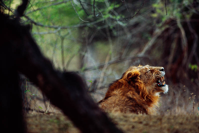 A lion roaring somewhere in an Indian forest. Lion roars are so powerful they can be heard from up to 8 kilometers from its original location