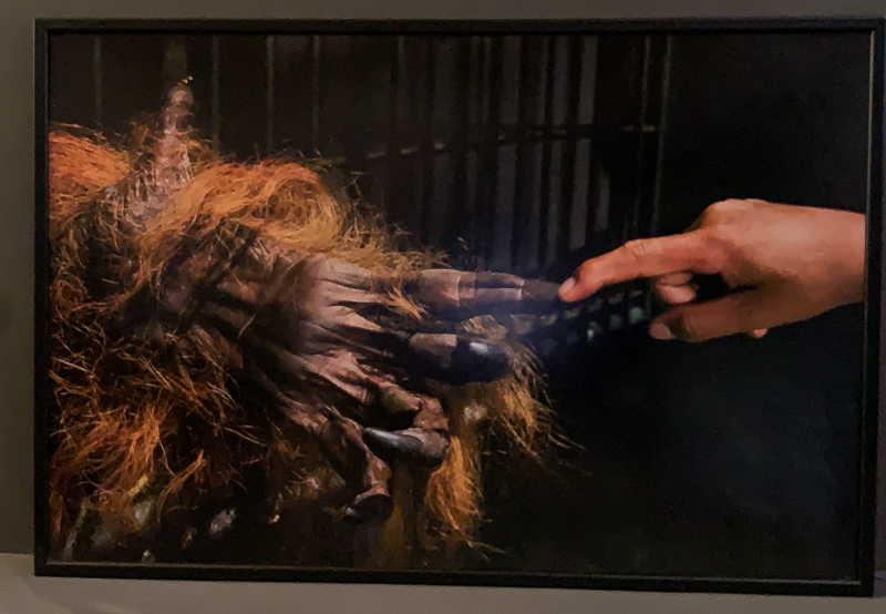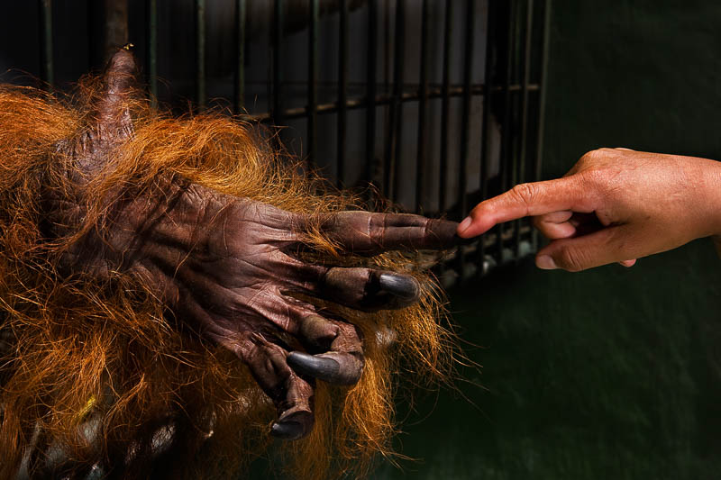 He was kept in a tiny cage for too long. His hands and feet are permanently damaged because of that.