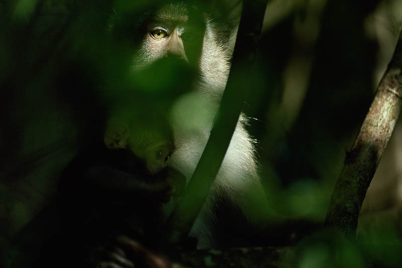 A mysterious picture of a crab-eating macaque, looking into the camera trough the leaves and branches
