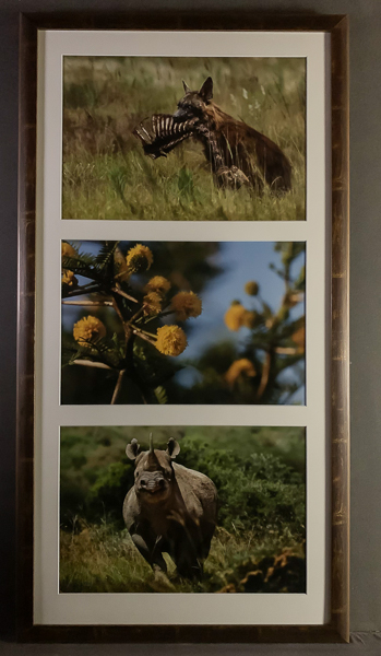Hyena with prey, Flowers and Rhinoceros is a wonderful triptych from Africa
