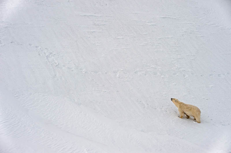 A lonely polar bear looking up, wandering trough the freezing vastness of Svalbard.